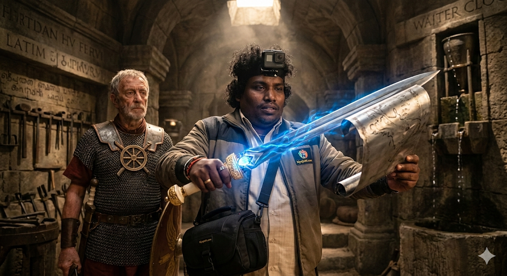 ​யோகி தனது 8K கேமராவை அந்த உருவத்தின் மீது நிலைநிறுத்தினான். “இல்லை… இது நம்ம முன்னோர்களோட ‘யந்திர மனிதன்’. சித்தர்கள் சொன்ன அந்த ‘இயந்திரப் பாவை’ இதுதான்!” என்று யோகி மெல்லக் கூறினான். அவன் தனது இடுப்பில் இருந்த அந்தப் ‘பல்லடத்துச் சூரிய வாளை’ (Solar Sword) எடுத்து, அந்த உருவத்தின் கையை நோக்கி மெல்ல நீட்டினான்.