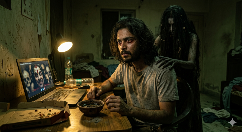 மணி சரியாக 1:15. லேப்டாப் திரையில் ஒரு ஸ்கைப் (Skype) அழைப்பு வந்தது. மறுமுனையில் கேமரா ஆன் ஆனது. ஆனால் வெளிச்சம் இல்லை. மங்கலான சிவப்பு விளக்கொளியில், முகம் முழுக்கத் திருநீறும் குங்குமமும் பூசிய ஒரு உருவம் தெரிந்தது. அதன் பின்னால் மண்டை ஓடுகள் அடுக்கி வைக்கப்பட்டிருந்தன.
